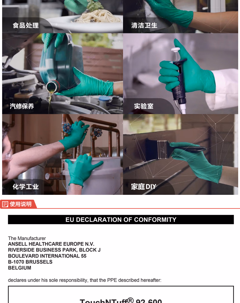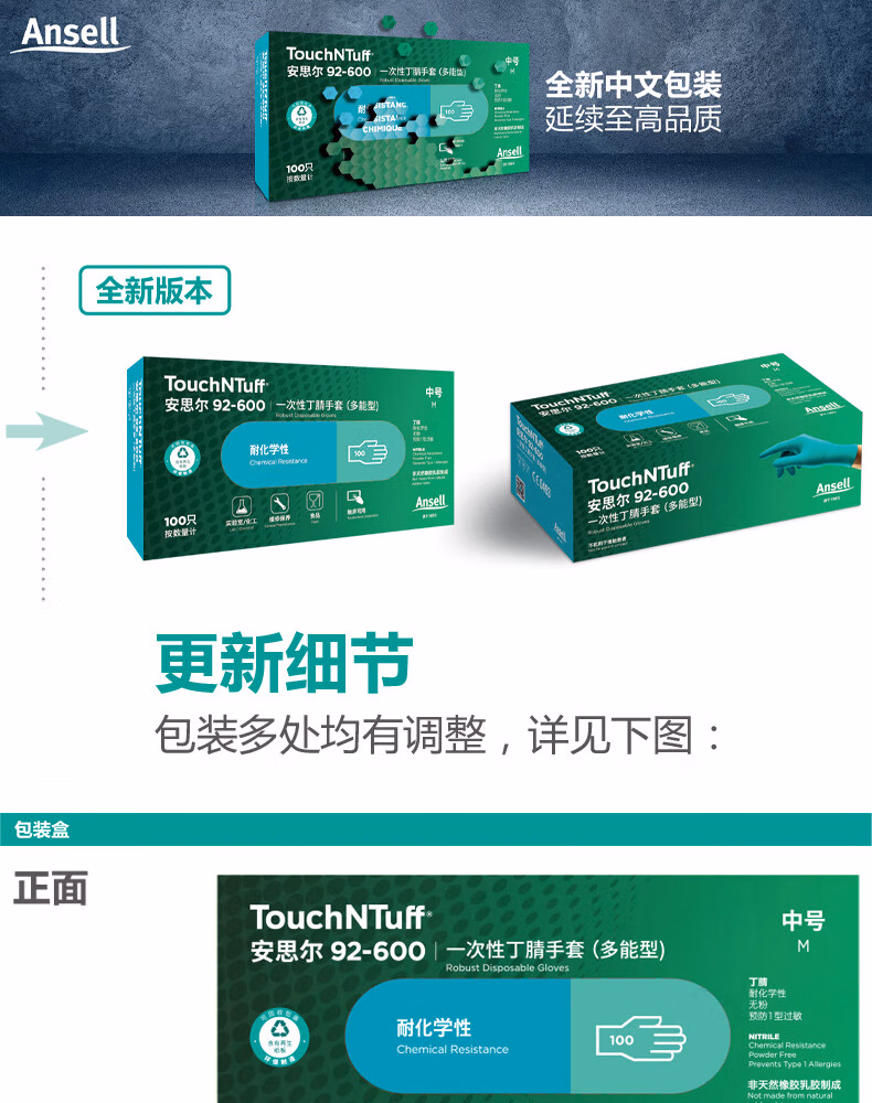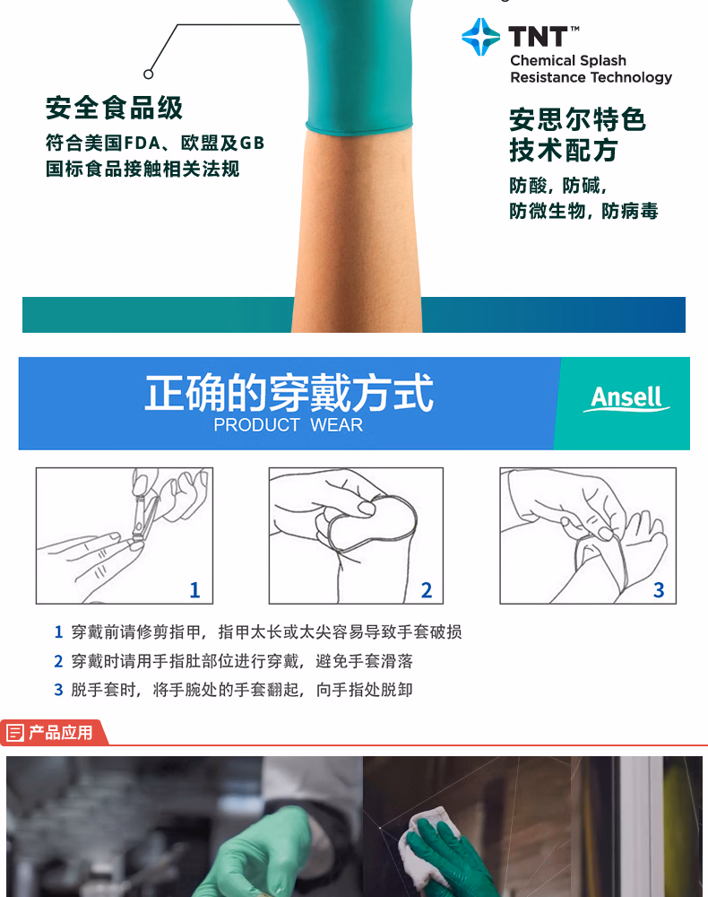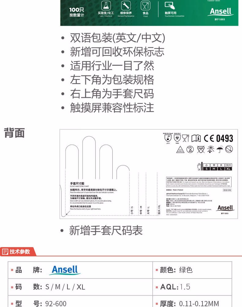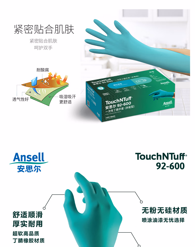 Ansell安思尔 一次性丁腈橡胶手套 绿色(L),无粉,工业级,0.12mm厚,24cm长(CE认证,FDA,IOS),100只/盒;92-600-L